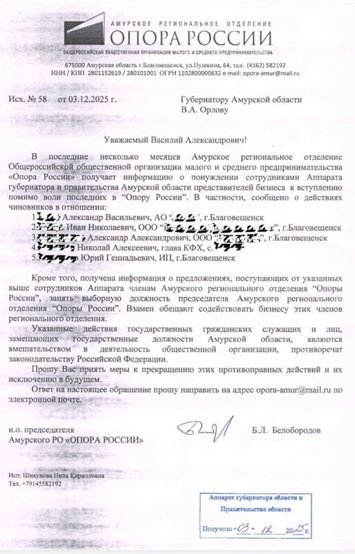 Скандал вокруг снятия главы Амурского отделения «Опоры России» продолжает развиваться. В офис и.о. председателя РО Бориса Белобородова на протяжении нескольких месяцев поступают сигналы от местных бизнесменов о попытках областных чиновников принудить их к вступлению в «Опору» с условием поддержки позиции губернатора Василия Орлова и президента организации Александра Калинина. Это происходит на фоне отказа президиума «Опоры России» признавать итоги состоявшихся в июле выборов председателя отделения, участники которых проголосовали за Белобородова.