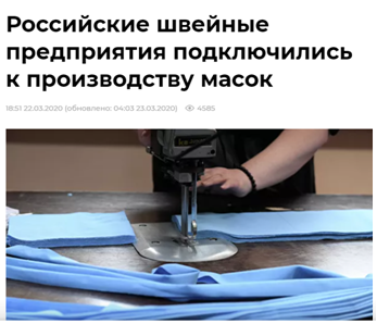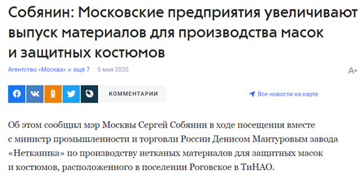 Возможно, на старте эпидемии в Москве действительно ощущался дефицит масок из-за панических настроений и возникновения ажиотажа, впрочем, как и с пресловутой гречкой, которую теперь почему-то уже не скупают с таким рвением. Чтобы устранить нехватку медицинских изделий, к работе были подключены дополнительные предприятия.
