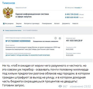 Заявка на проведение работ по метеозащите столицы действительно была размещена в Единой информационной системе в сфере закупок в начале февраля – задолго до введения режима повышенной готовности. Это стандартная практика, которая уже давно применяется в Москве. Претензии со стороны Тимонова говорят о том, что оппозиционер не знает, как работает система госзакупок.