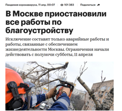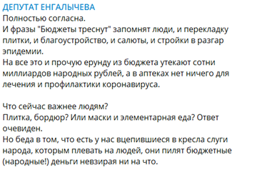 В начале апреля оппозиционный депутат Енгалычева кричала о необходимости остановки строек и работ по благоустройству Москвы, подкрепляя свои спичи громкими фразами о том, что работы все равно не будут остановлены, поскольку власть не заботится о людях.