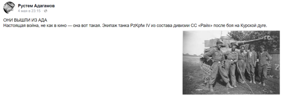 9 мая для них не праздник, а возможность для провокации. Каждый год они устраивают пляски на костях. Таких примеров немало. Оппозиционный блогер Рустем Адагамов, который героизировал немецких захватчиков.