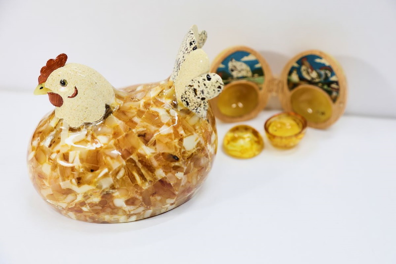 «Для сувенирной линейки к форуму была задана тематика по мотивам русской природы, пасторальных пейзажей. Я решил передать образ через свои детские воспоминания о деревенском доме моей бабушки. Для меня русская деревня – это куры, поля, приземистые домики. За этой простотой стоит многовековая история, свой уклад, традиции. В сувенире объединились мотивы народных сказок – про курочку, про Кащея Бессмертного: курица сидит на яйце, в котором – желток, а в желтке – миниатюрный цыплёнок», – пояснил художник по янтарю Вячеслав Малышев.
