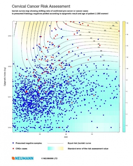 В то время как традиционные методы не выявляют каких-либо признаков развития злокачественной опухоли, в результате теста, проводимого по запатентованному алгоритму компании NEUMANN, для каждой женщины может быть установлена индивидуальная степень риска предракового состояния или заболевания раком шейки матки.