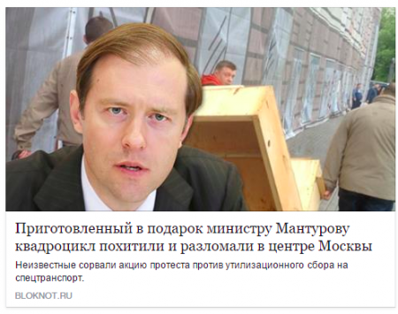 В этот раз жертвой акции активистов стал ничего не подозревающий министр промышленности и торговли Денис Мантуров. Целью акции было доказать министру то, что российская промышленность неспособна ни сейчас, ни в будущем конкурировать с западными производителями. Поэтому нужно сейчас сдаваться и открыть все возможности для ввоза зарубежной техники. Акции по лоббированию отмены утилизационного сбора проводятся уже не впервые при поддержке дистрибьюторов иностранной техники. Удивительно в этой акции то, что Константин Алтухов, передвигающийся по городу на своем российском автомобиле «Газель» (на котором он привез деревянный квадроцикл) в этот раз занял сторону борьбы против отечественного производителя. По всей видимости иностранный капитал важнее, чем идеи патриотизма.