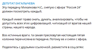 Оппозиционный депутат Енгалычеваактивно поддерживает популярную теорию заговора о том, что при помощи прививки от COVID-19 тайное мировое правительство намерено бороться с перенаселением на Земле.