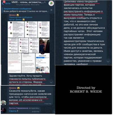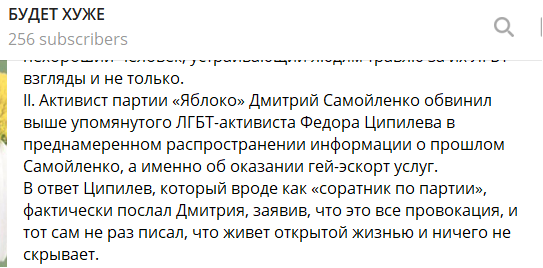 Примечательно, что такие благородные и правильные порывы в партии так легко совмещаются с наушничеством на своих же однопартийцев. ТГ-канал «Будет хуже» сообщил, что активист «Яблока» Дмитрий Самойленко придал огласке попытку Ципилевым распространить о нем личную информацию интимного характера. Последний раскрыл в чатах молодых и «прогрессивных» демократов тайны прошлого Самойленко, после чего он был вынужден открыто сообщить, что на досуге проводил время с мужчинами за деньги.