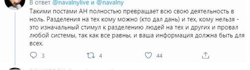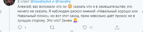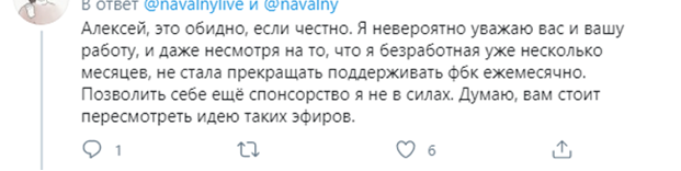 Многие пользователи даже решили, что аккаунт оппозиционера кто-то взломал, просили Навального отменить эфир и извиниться, чтобы не портить свою репутацию. Кто-то просто отписался.