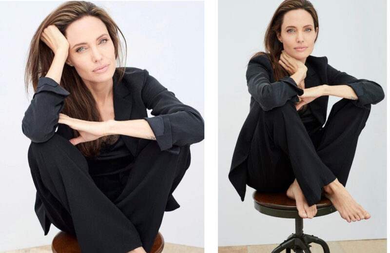 Анджелина прекрасна всегда! Но так как она такой же человек, как и все, хоть и звезда, то промахи с позированием случаются и у неё. На первом фото мы видим очень странную, неженственную позу. Важный маркер, когда мы пытаемся понять, так или не так что-то с позой, то нужно представить, возможна ли такая поза в реальной жизни. Сложно вообразить, что так можно сидеть и болтать с подружкой. И будем честны, просто делая селфи в зеркало, мы маловероятно так сядем.