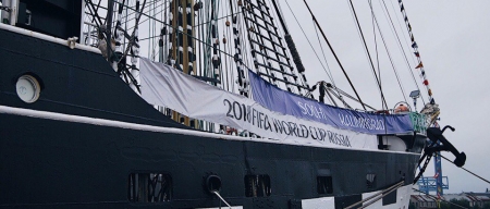Судно было украшено по случаю проведения роад-шоу символикой предстоящего Чемпионата мира по футболу.