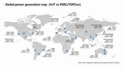 С этой целью компания Risen Energy Co., Ltd собирает основные параметры этих трех технологий и измеряет выработку электроэнергии электростанциями коммунального масштаба, работающими на элементах с использованием этих трех технологий, на протяжении 25-летнего жизненного цикла в 21 типичной стране и регионе с различными климатическими условиями по всему миру для создания сравнительной карты прироста мировой выработки электроэнергии.