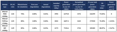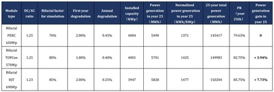 В качестве типичного примера для сценария применения при высоких температурах был выбран Абу-Даби на Ближнем Востоке, который расположен вблизи 24,4° северной широты, со среднегодовой температурой 28,5°C и суммарным солнечным излучением, падающим на горизонтальную поверхность, 2015,1 кВт⋅ч/м2. Электростанция спроектирована с соотношением постоянного/переменного тока 1,05 и установленной мощностью 4 МВт (с небольшими отклонениями в фактической конструкции), с применением оптимального угла наклона для фиксированного кронштейна и подходящих струйных инверторов. К 25 году прирост выработки электроэнергии модулями TOPCon составит 4,52%, а прирост выработки электроэнергии модулями HJT будет еще выше — 9,67% по сравнению с выработкой электроэнергии модулями PERC, как показано в таблице 3.2.